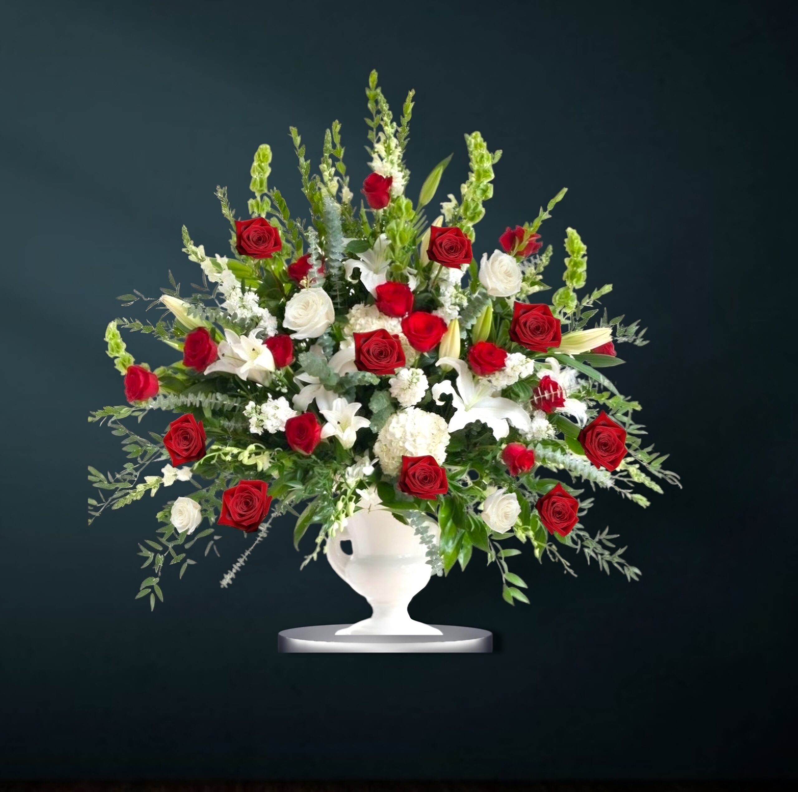 Elegant White and red Sympathy arrangement, Everyone is sure to appreciate this beautiful arrangement, whether it arrives at a home or at the service. White and red blooms and rich greenery creates an elegant and peaceful presentation.