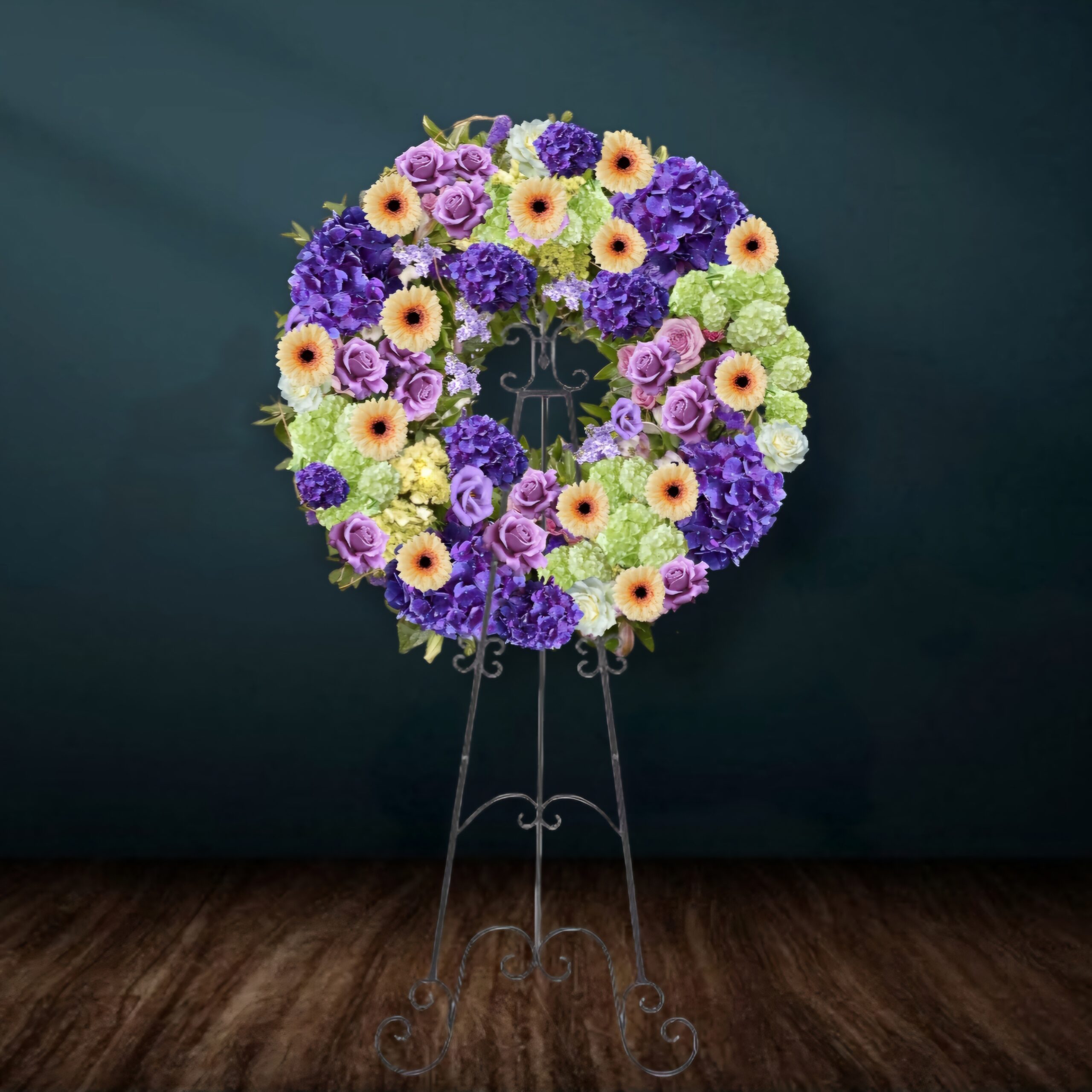 This beautiful floral tribute shows your undying love during this difficult time. This standing spray wreath arrangement – is created from fresh seasonal flowers, in purple, peach, and green. Traditionally sent directly to the funeral home by family members or friends and displayed on a stand. Our florists use only the freshest flowers available so varieties may vary.