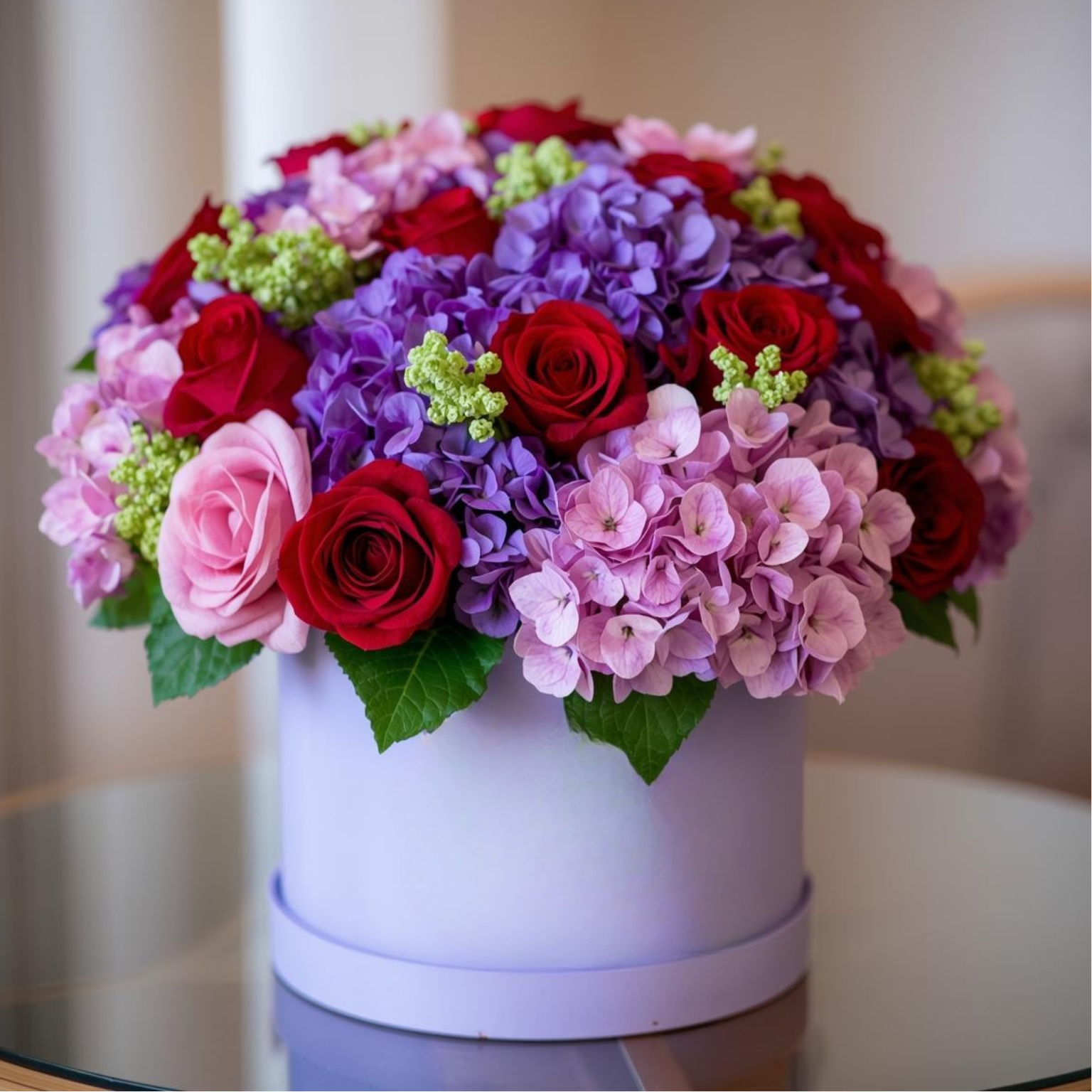 An elegant floral box arrangement featuring a luxurious blend of velvety red and soft blush roses, embraced by lush hydrangeas in shades of lavender and pink, with delicate green accents for balance and freshness. Designed in our signature hat box, this arrangement is full, romantic, and visually rich from every angle.