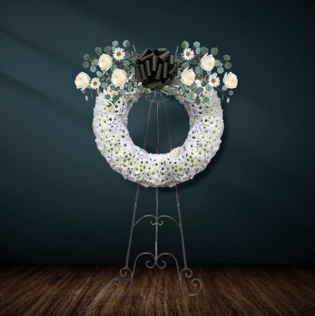 This beautiful floral tribute shows your undying love during this difficult time. This standing spray wreath arrangement is created with fresh white daisies, white mini gerberas, white roses and beautiful eucalyptus greenery. Traditionally sent directly to the funeral home.