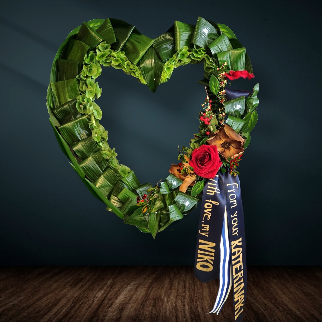 This beautiful floral tribute shows your undying love during this difficult time. This standing spray arrangement – in the shape of a heart – is created from fresh aspidistra leaves, fresh red roses, and extra beautiful details. Traditionally sent directly to the funeral home by family members or friends and displayed on a stand.