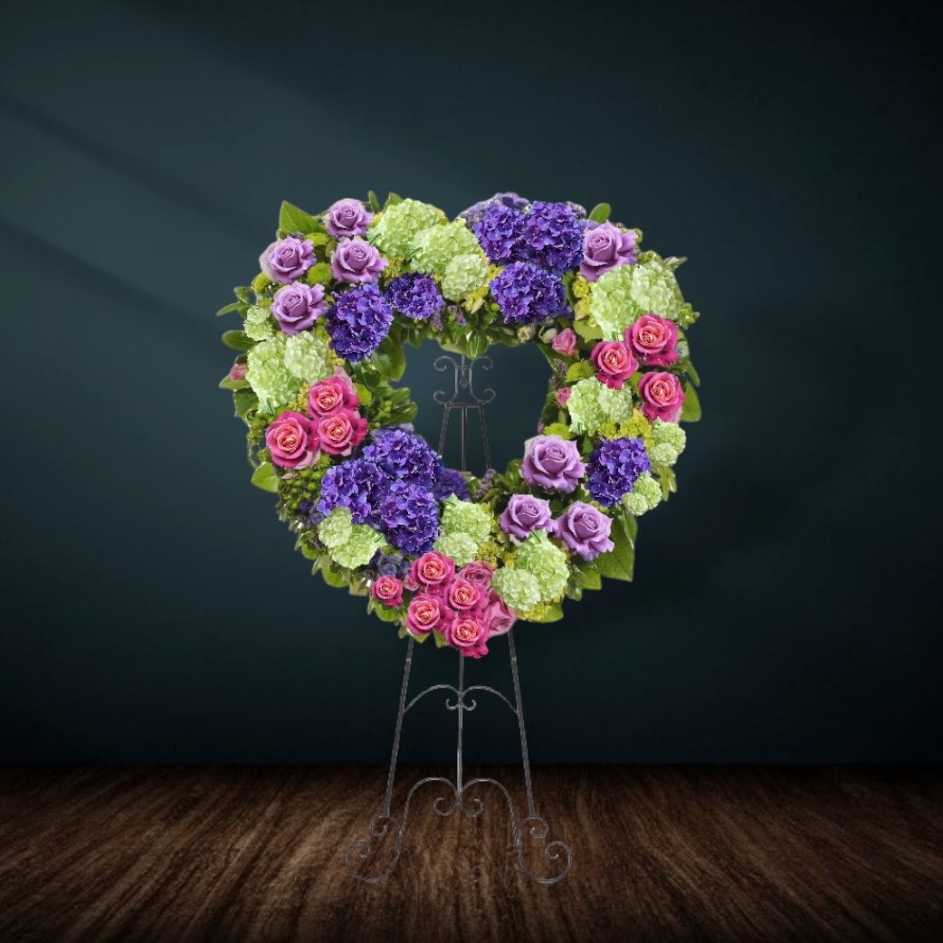 This beautiful floral tribute shows your undying love during this difficult time. This standing spray arrangement – in the shape of a heart. Traditionally sent directly to the funeral home by family members or friends and displayed on a stand. Our florists use only the freshest flowers available so varieties and colors may vary.